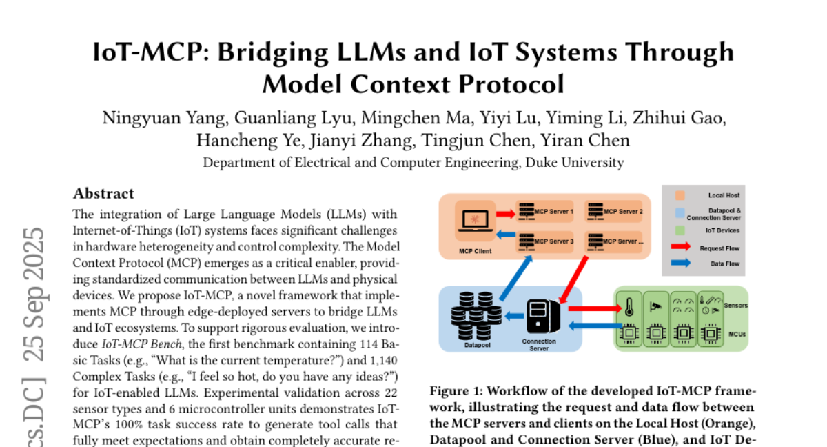 A:IoT-MCP是杜克大学开发的一个物联网控制框架,它就像一个"智能翻译官",让你可以用自然语言直接控制各种智能设备。比如你说"我觉得房间太热了",系统就能自动读取温度传感器数据并给出建议。它支持22种传感器和6种不同的微控制器,实现了100%的任务成功率。